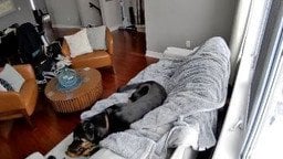 Камера для спостереження за домашніми тваринами зафіксувала момент, коли пес бавився рукавичкою на дивані, а потім злякався, коли вона почала диміти.