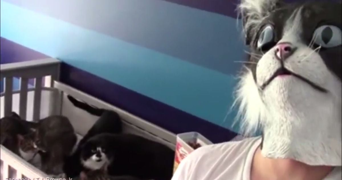Спочатку чоловік, обличчя якого приховує маска кота, каже кілька слів на камеру, потім різко повертається до ліжечка, у якому відпочивають 5 пухнастиків. Перелякані тварини настільки вражені "чудовиськом", що миттєво розбігаються у різні боки.
