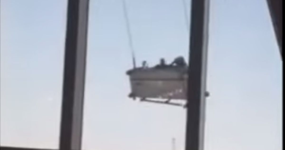 На відео можна побачити вікно хмарочоса, навпроти якого зафіксована спеціальна платформа для миття вікон. Через шалений вітер її хитає у різні боки з такою силою, що платформа б'ється у вікно та в якийсь момент з неї вилітають інструменти.