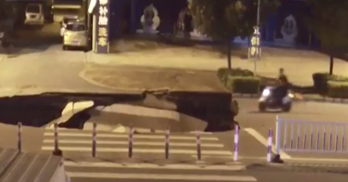 У Китаї водій скутера провалився у величезну яму, які з'явилася посеред дороги.