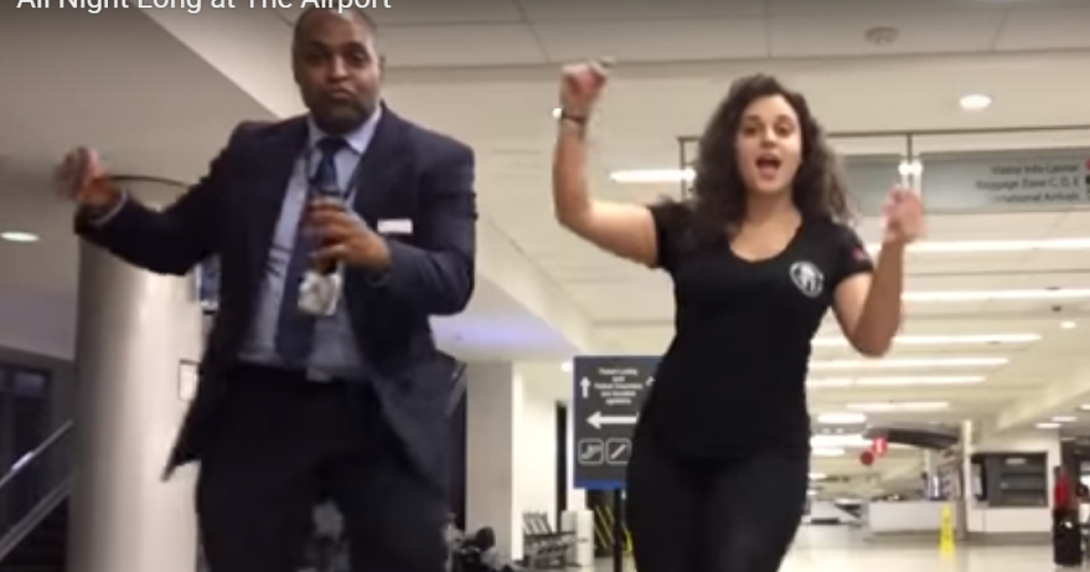 Американка на ім’я Махшід Мазуджі на цілу ніч застрягла в міжнародному аеропорту "Charlotte Douglas" ("Шарлотт Дуглас"), проте вирішила не втрачати час даремно та трохи розважитись. Тому жінка потанцювала разом з працівниками летовища.