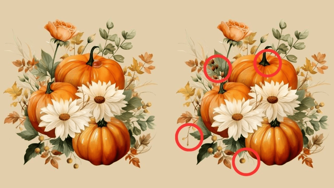 На двох яскравих зображеннях нашої нової головоломки із гарбузами та квітами приховано 4 деталі, що відрізняють одне фото від іншого. Ваше завдання — відмітити їх усі менше ніж за 23 секунди.