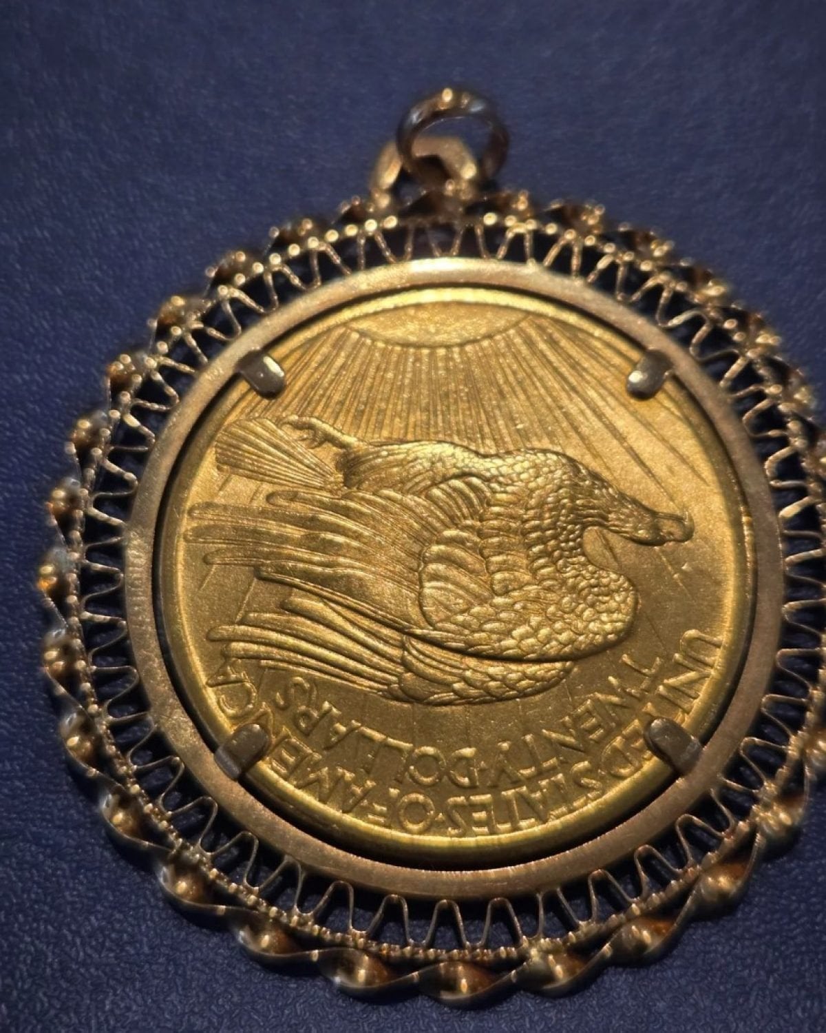 На золотій підвісці була закріплена старовинна монета з зображенням орла, який летить над сонцем, і написом «United States of America Twenty Dollars». На реверсі викарбувана статуя Свободи з факелом та оливковою гілкою, а також рік випуску — 1908.