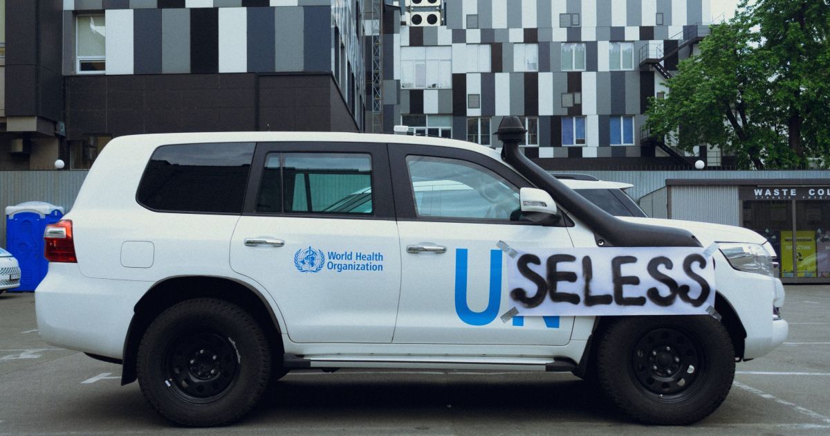 Після підриву Каховської ГЕС у Києві на автомобілях ООН з’явилися плакати англійською з написом "бездієві". Тепер їх збираються обміняти на автівки для ЗСУ.