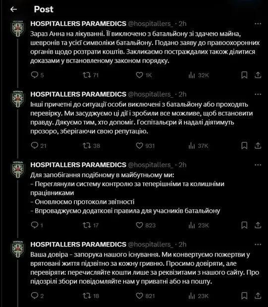 "Ми засуджуємо ці дії і зробили все можливе, щоб встановити правду. Дякуємо тим, хто допоміг. "Госпітальєри" й надалі діятимуть прозоро, зберігаючи свою репутацію. Закликаємо постраждалих також ділитися доказами у встановленому законом порядку", – підсумували в батальйоні.
