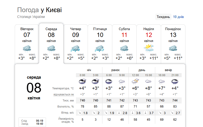 У Київській області та у місті Києві 8 квітня буде хмарно із проясненнями. Вдень та вночі пройдуть дощі, подекуди з мокрим снігом.