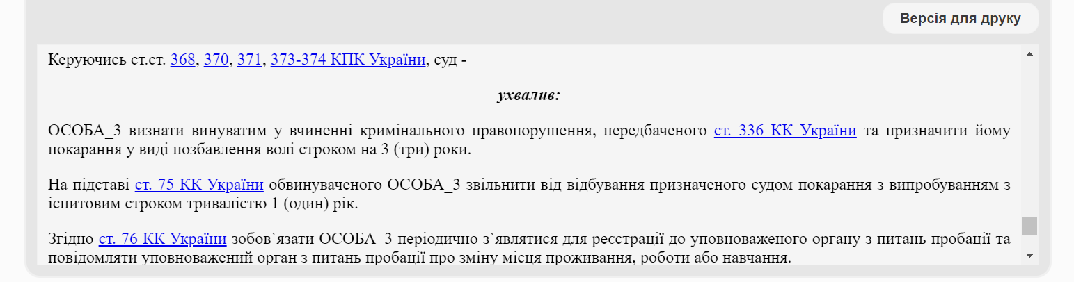 Суд проаналізував матеріали справи та визнав чоловіка винним за статтею 336 ККУ і засудив до іспитового терміну.