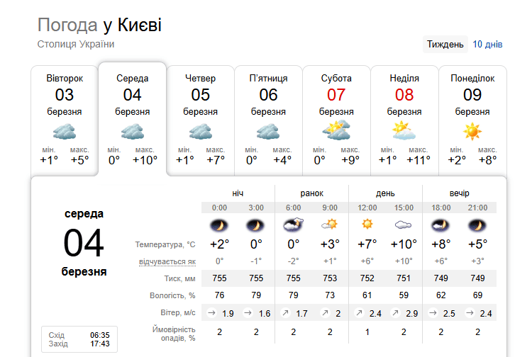 У Києві та області 4 березня очікується хмарна погода із невеликими проясненнями. Істотних опадів не передбачається.