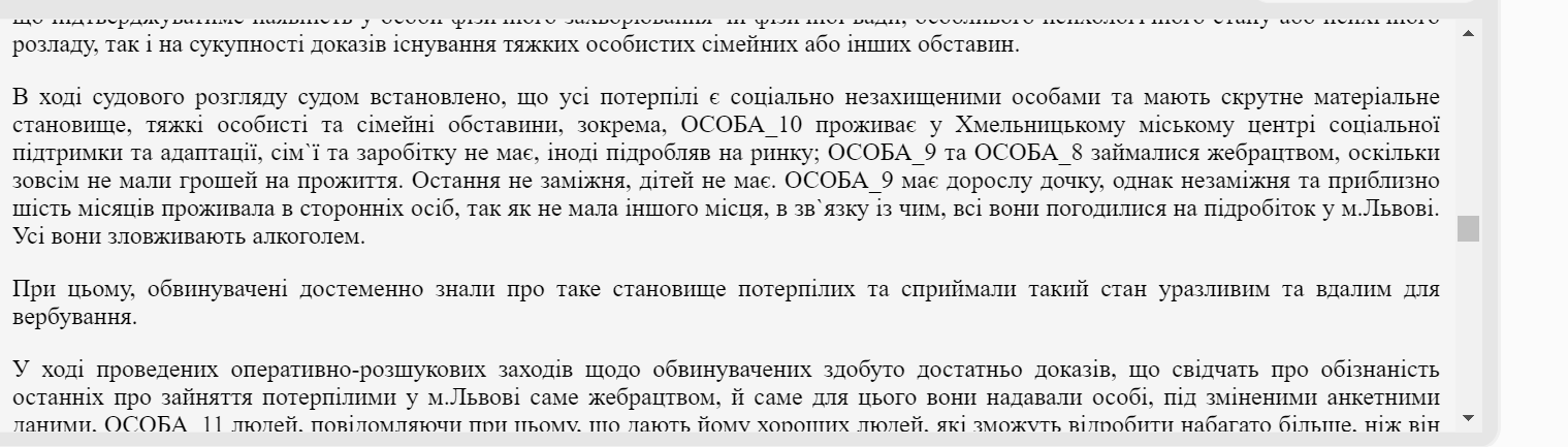 За даними суду, жінка та її спільник у квітні 2022 року познайомилися із трьома людьми – двома жінками та чоловіком, які перебували в уразливому стані та складному матеріальному становищі. Вони запропонували людям роботу, зокрема – жебракування.
