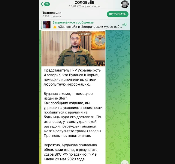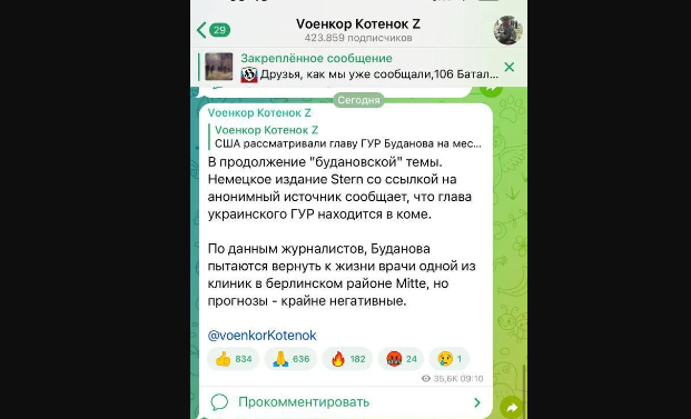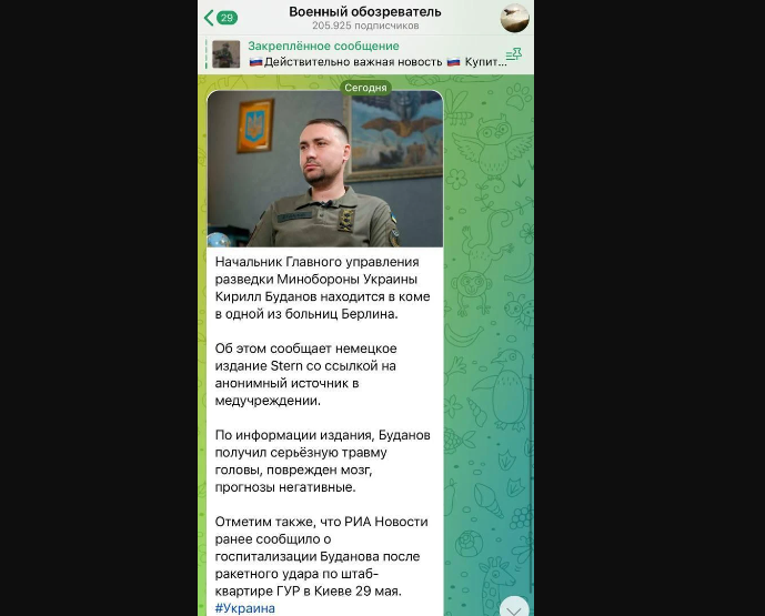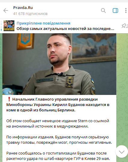 Пропагандисти, "воєнкори", Z-канали швидко пошили новини про нібито кому керівника української розвідки. Вони повідомляють, що цю інформацію розповіли медики закладу німецькому журналу Stern. Втім, на сайті видання нічого про це немає.