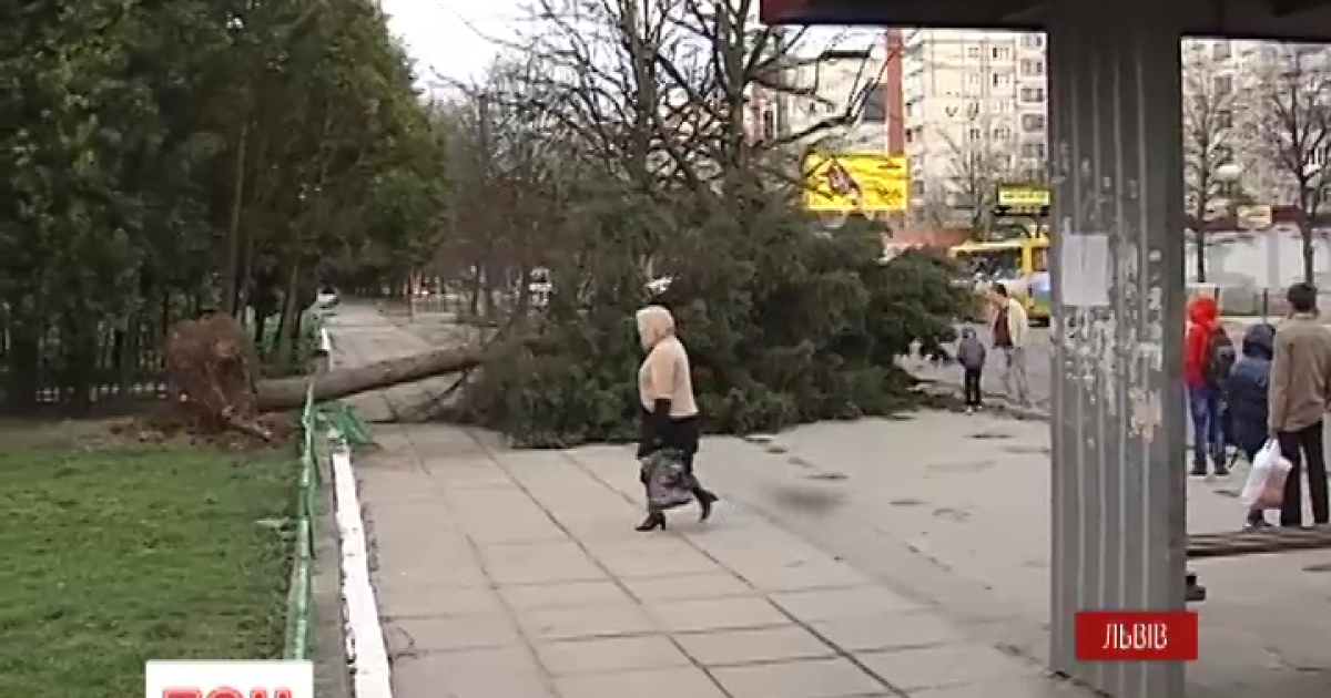 Вітер також повалив у місті кілька дерев. Одне із них упало біля зупинки громадського транспорту. Дивом ніхто не постраждав.