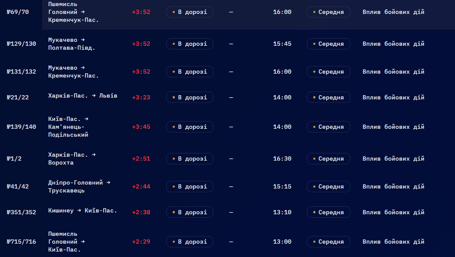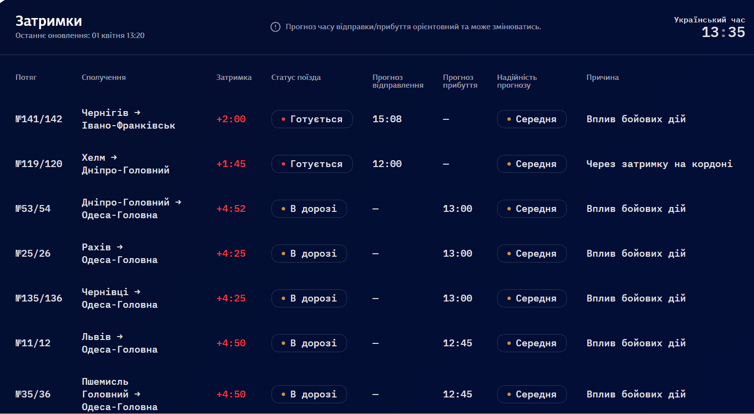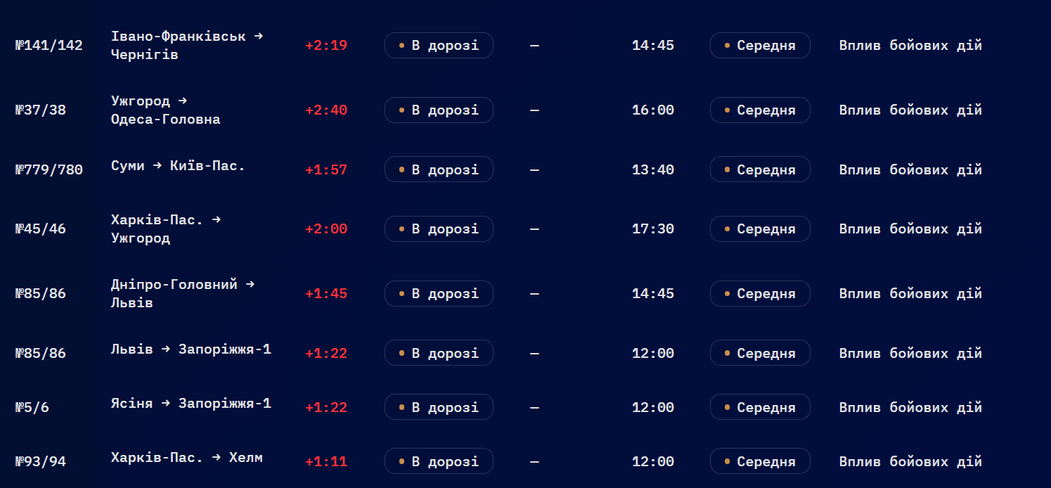 За даними компанії, більшість потяги затримуються у дорозі через «вплив бойових дій», деякі — не відправилися за графіком і досі не вирушили у рейси. Затримки фіксують у різних областях.