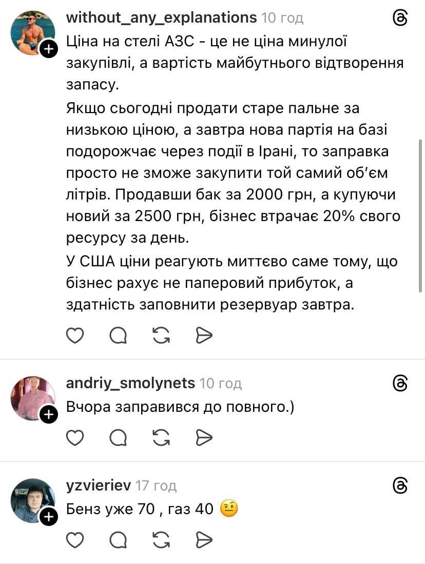 «А здорожчання пального на 1–2 гривні — це вже реакція ринку на вчорашній злет цін на нафту. Воно було дуже різким, і учасників ринку налякала невизначеність через війну на Близькому Сході. Вчора гуртовий ринок майже взагалі не працював. Вийшли лише три компанії з 30, які зазвичай торгують. Тобто майже всі вирішили притримати товар, щоб розібратися, що відбуватиметься далі», — пояснив експерт.