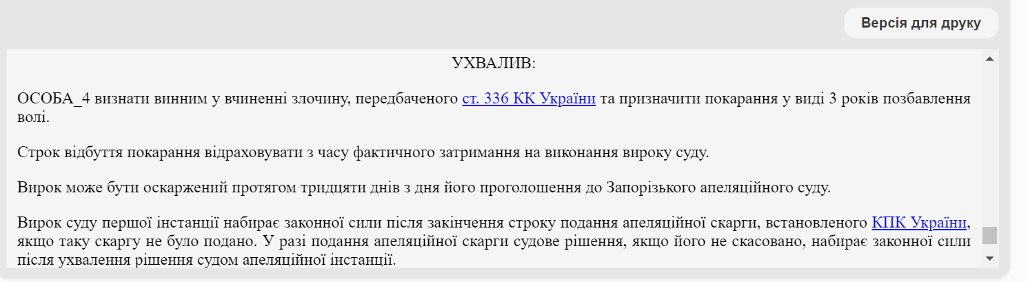 Суд проаналізував матеріали справи визнав чоловіка винним за статтею 336 ККУ. Його засудили до 3 років позбавлення волі.