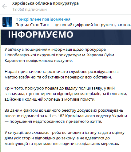 За даними прокуратури, правоохоронці відкрили кримінальну справу за ч. 1 ст. 182 Кримінального кодексу України — порушення недоторканності приватного життя.