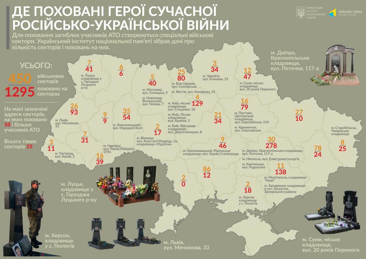 "Для поховання загиблих учасників АТО на кладовищах створюються спеціальні військові сектори. Український інститут національної пам'яті зібрав дані про кількість уже наявних секторів і поховань на них", - говориться у повідомленні.