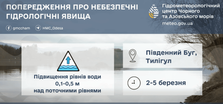 Окрім того, синоптики попереджають про гідрологічну небезпеку жовтого рівня. Через танення снігу та роботу водогосподарських об’єктів протягом 2–5 березня на річках Тилігул (район Березівки) та Савранка (притока Південного Бугу) очікується підйом рівнів води з її подальшим утриманням на заплавах.