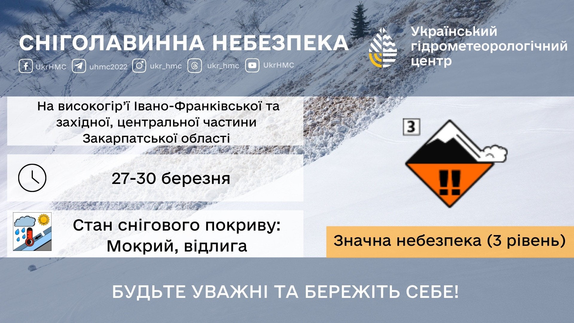 Складна ситуація зберігається і в горах через активне танення снігу та опади. На високогір’ї Івано-Франківської області, а також у західній та центральній частинах Закарпаття оголошено третій рівень сніголавинної небезпеки, який триватиме до 30 березня.