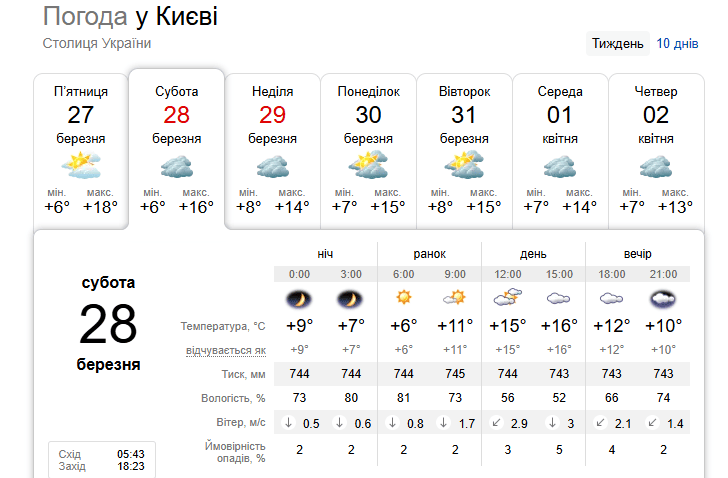 Удень 29 березня очікується найтепліша погода — до +18 градусів вище нуля. У понеділок, 30 березня, денний максимум становитиме від +11 до +16 градусів вище нуля.