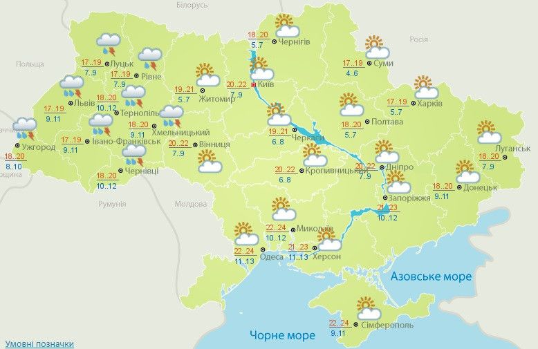 У Києві температура вдень коливатиметься від 20 до 22 градусів. Найпрохолодніше буде на заході: тут вдень температура стартуватиме від 17 градусів тепла.