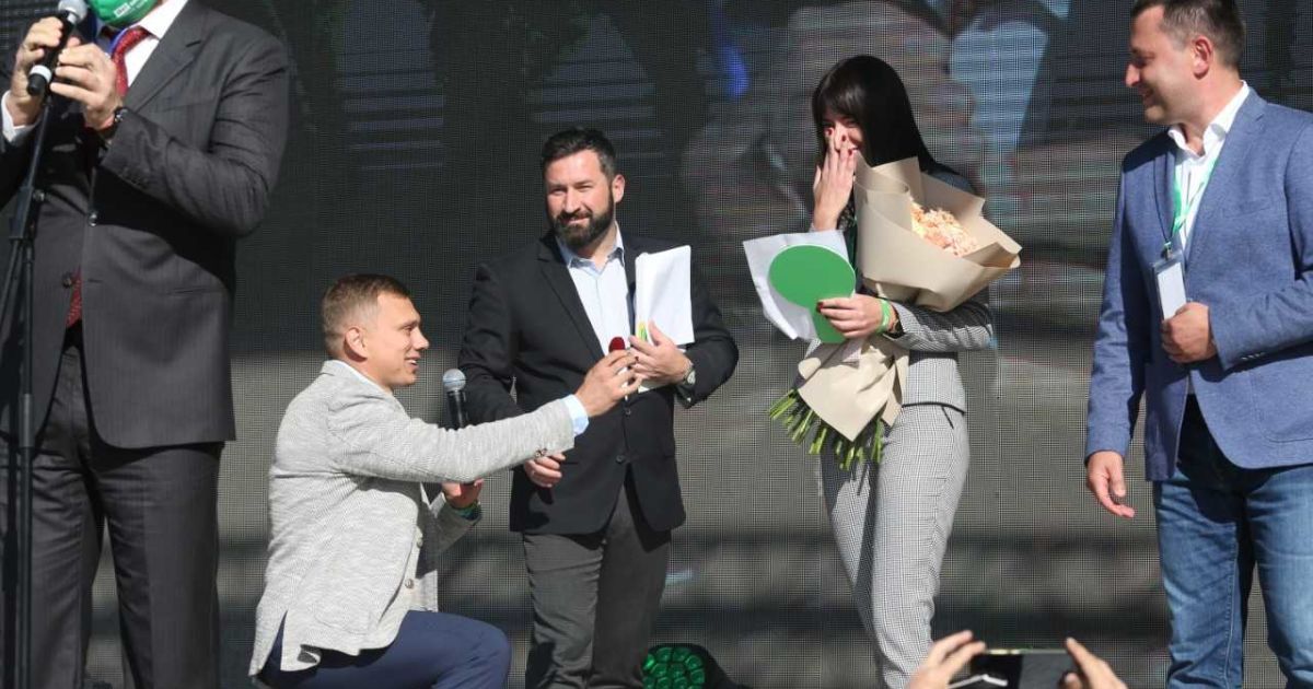 Сьогодні в Слов'янську, під час передвиборчого з'їзду "Слуги народу" в Донецькій області, кандидат в депутати з Краматорська Володимир Алдохін зробив пропозицію руки і серця Катерині Проценко — кандидатці в депутати із сусідньої Костянтинівської громади.