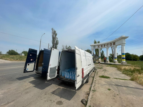 Допомогу везли двома бусами. Всередині розмістили більше ніж три тонни питної води та тонну медичних засобів для одного з найбільших лікувальних закладів Херсонщини - КНП "Херсонська міська клінічна лікарня ім. О.С.Лучанського".
