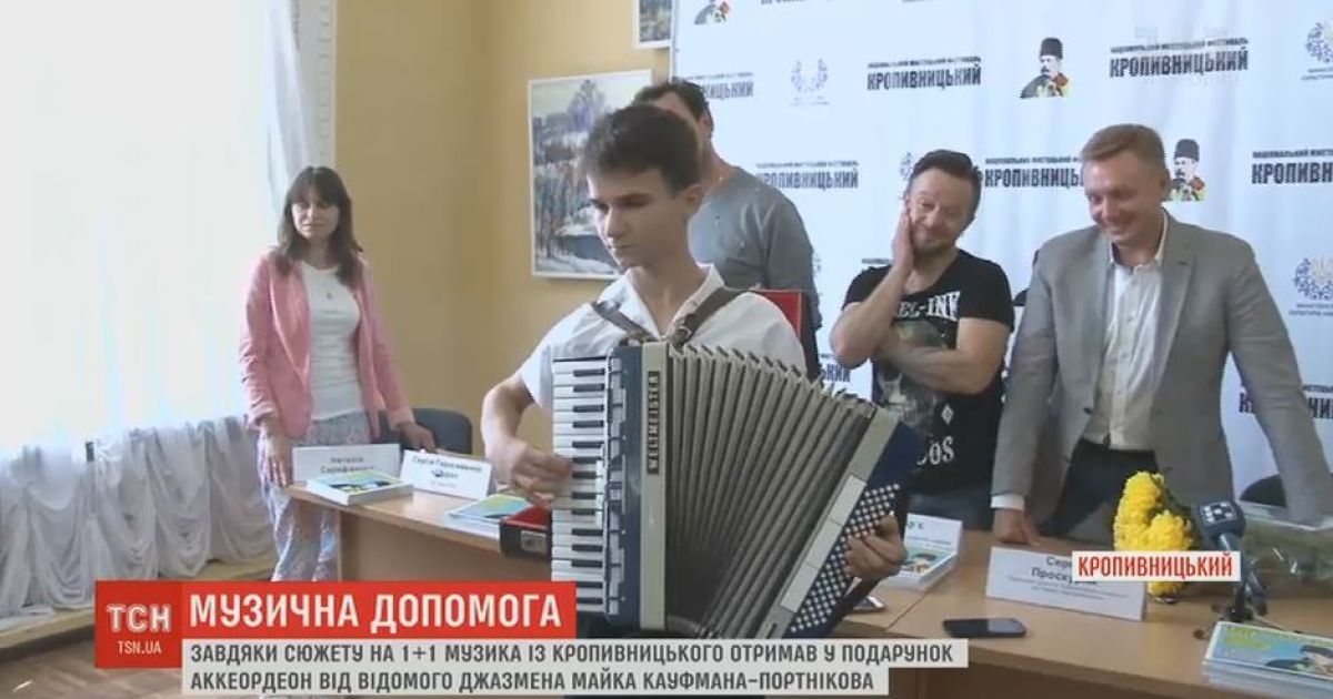 Завдяки ТСН 14-річний кропивничанин-музикант зі слабким зором Артем Ковальчук отримав концертний акордеон. Хлопчик ціле літо грав на вулицях міста, щоб назбирати на інструмент, бо не було на чому вправлятися. Сюжет про це розчулив глядачів 1+1 і багато хто запропонував допомогу, йдеться в ТСН.12.00.