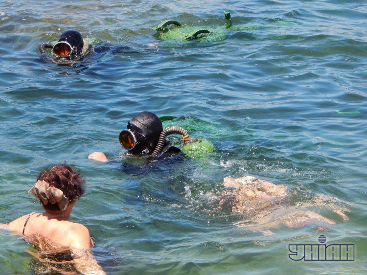 Оскільки зараз розпал курортного сезону, то на пляжах Севастополя безліч туристів. В морі знайшлося місце всім – і пловцям у скафандрах, і курортникам в плавках. Навчання моряків неабияк потішили гостей Криму.