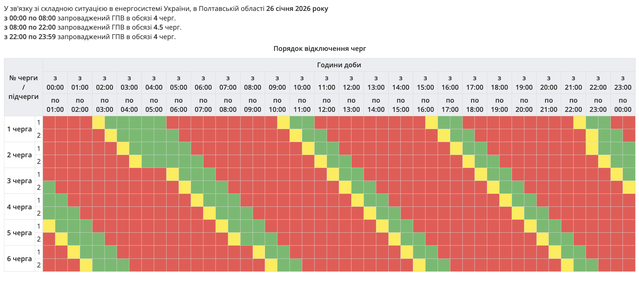У Полтавській області 26 січня ГПВ буде організовано так: