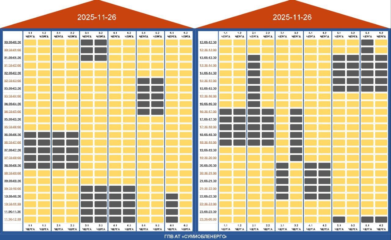 На зображенні: жовті віконця — години, коли є світло, темні віконця — години без електрики 26 листопада