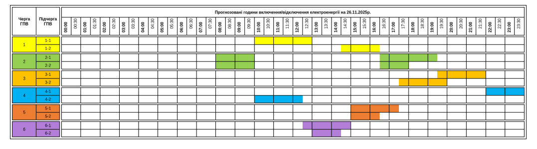 Години відсутності електропостачання за чергами/підчергами (з урахуванням 30 хвилин на перемикання):