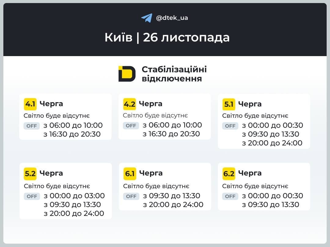 Графік відключення світла в Києві 26 листопада / © ДТЕК