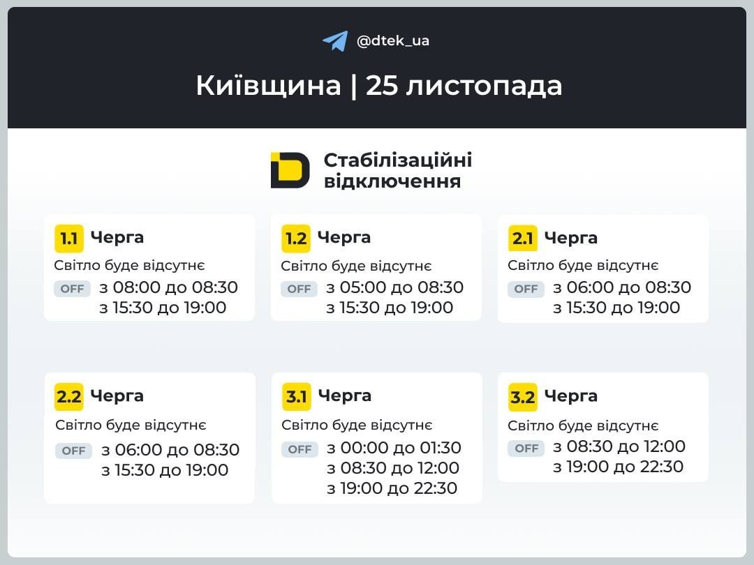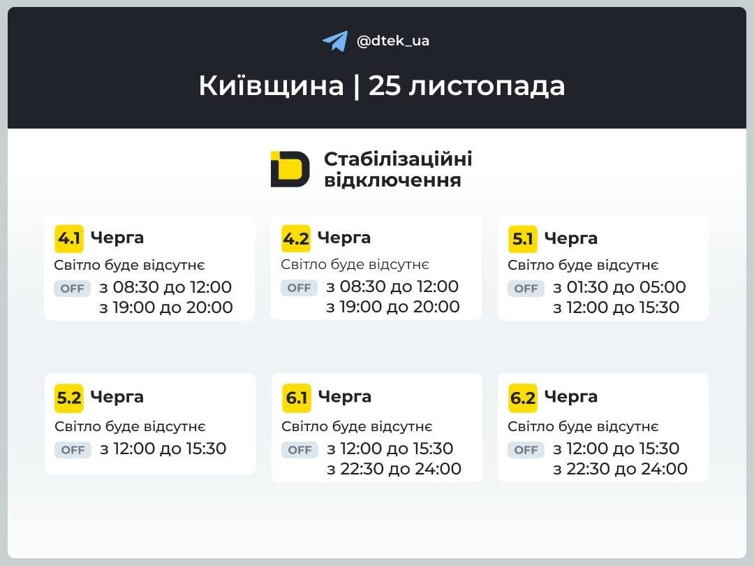 Графіки відключення на Київщині на 25 листопада / © ДТЕК
