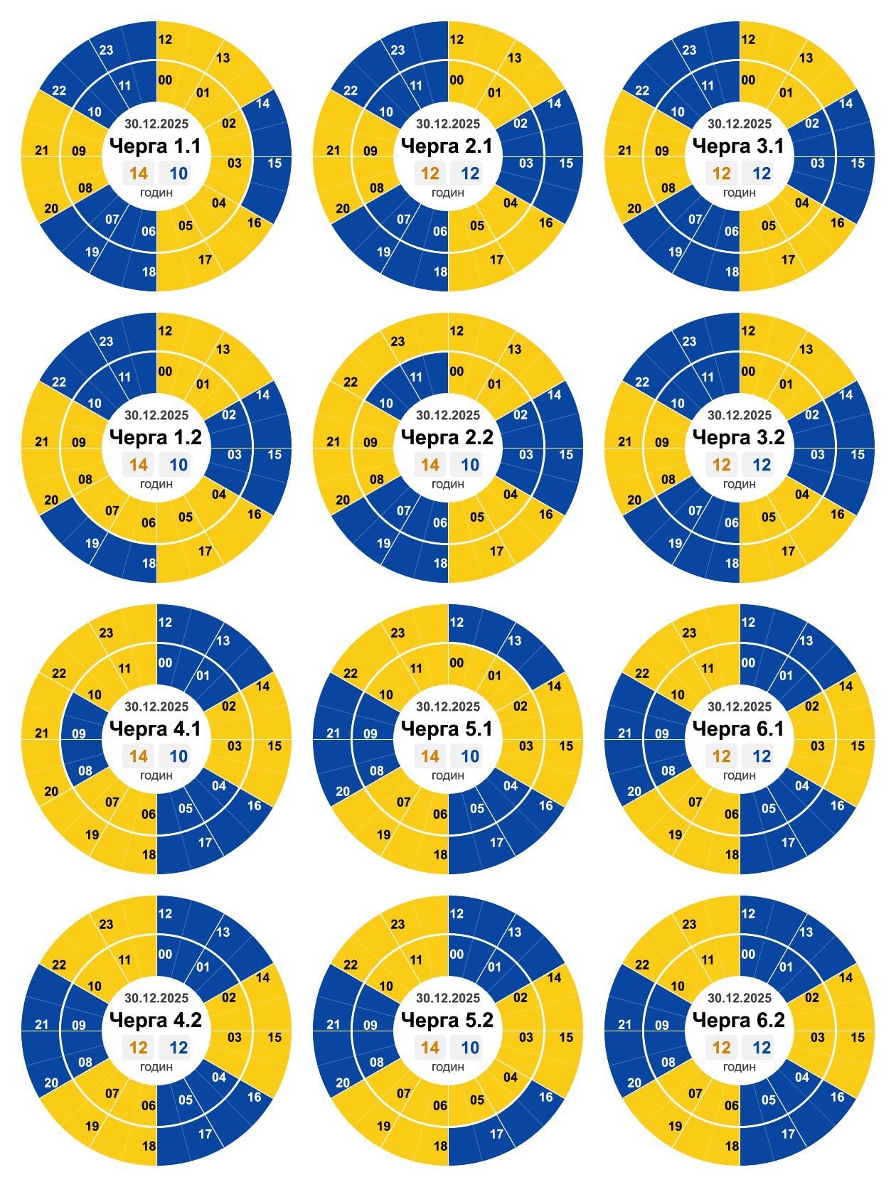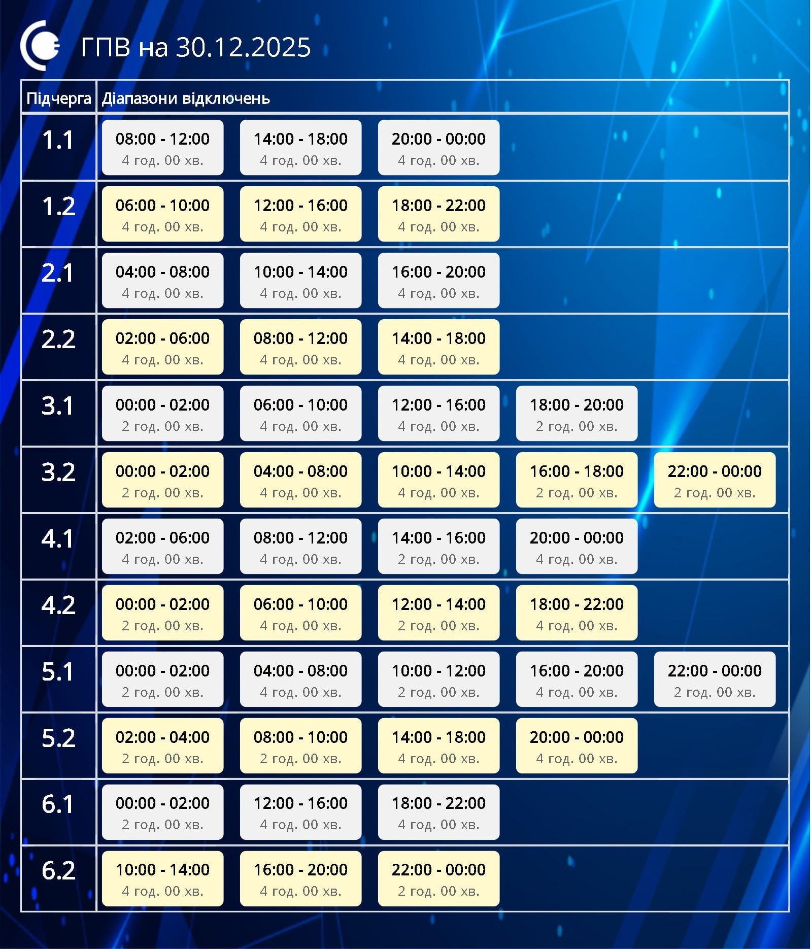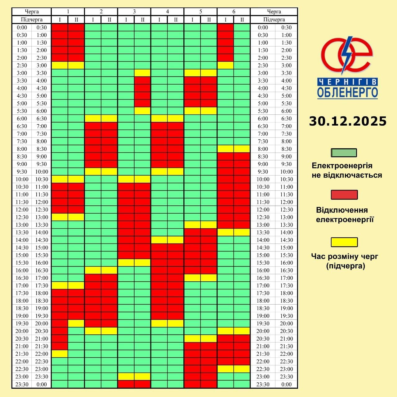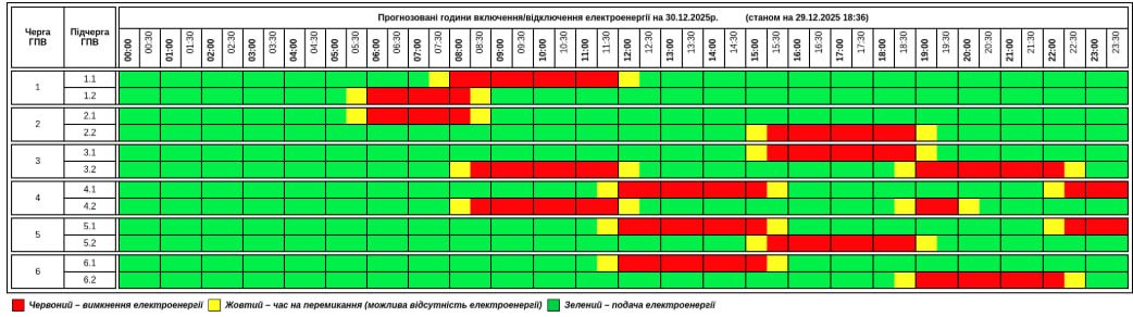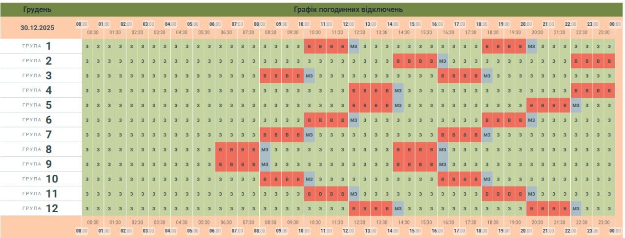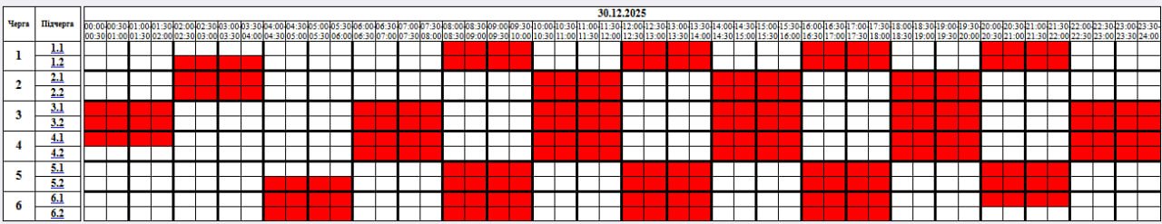 За розпорядженням НЕК «Укренерго» 30.12.2025 буде діяти наступний графік погодинних відключень (ГПВ):
