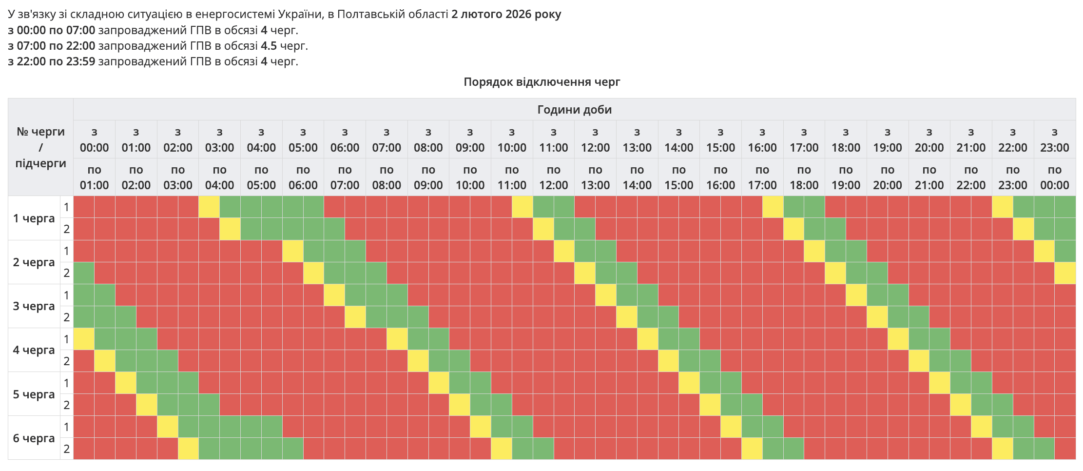 У зв'язку зі складною ситуацією в енергосистемі України, в Полтавській області 2 лютого 2026 року.