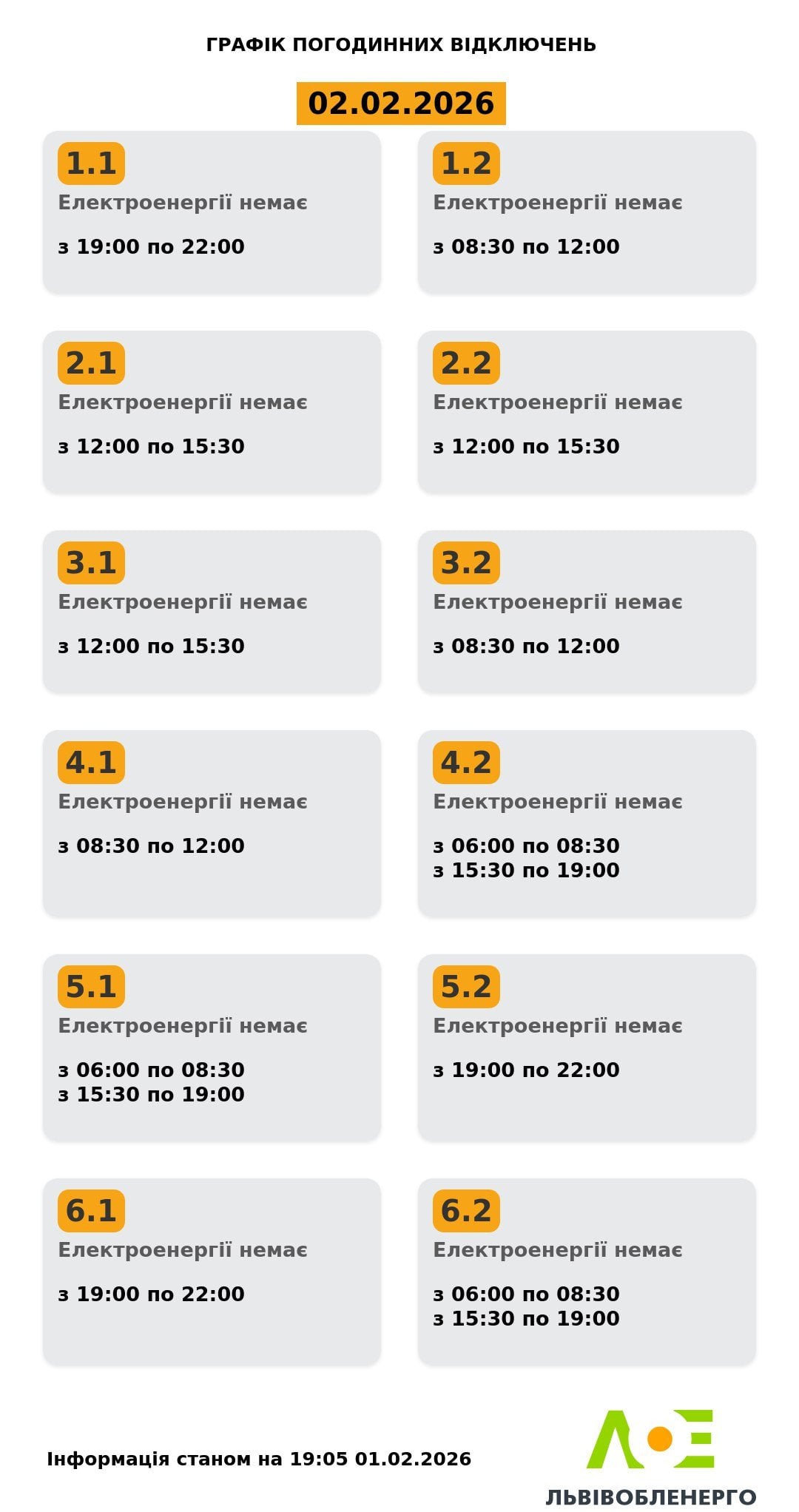 Завтра, 02 лютого, діятимуть графіки погодинних відключень відповідно до обсягів, доведених командою з НЕК "Укренерго".