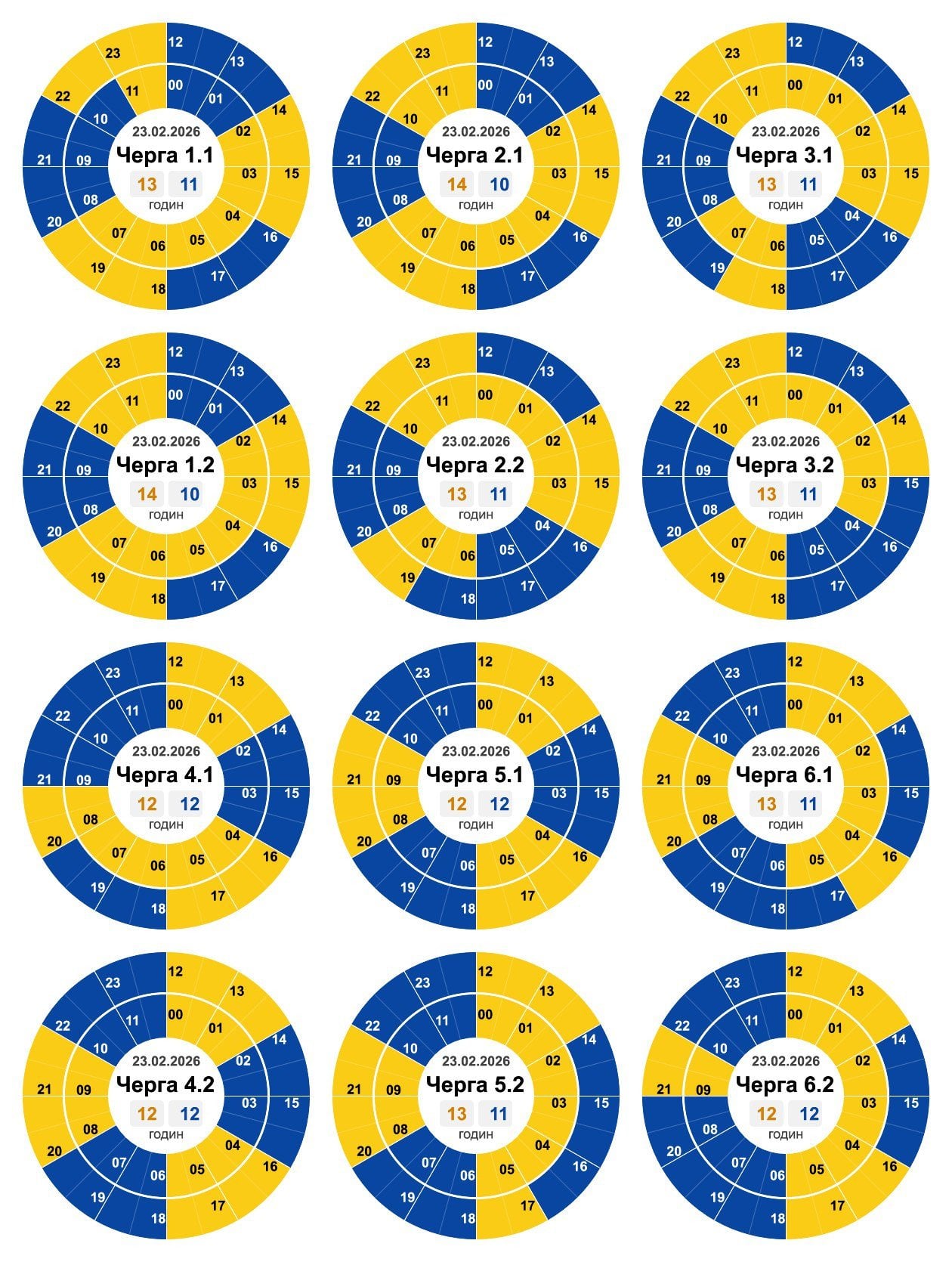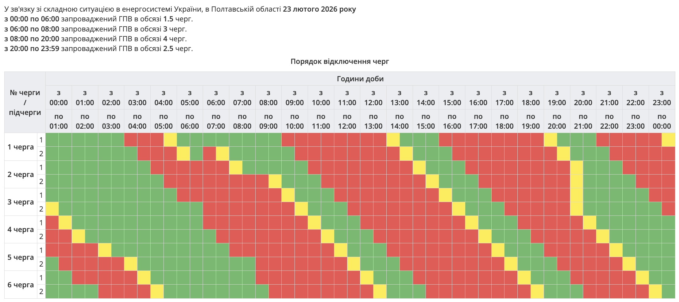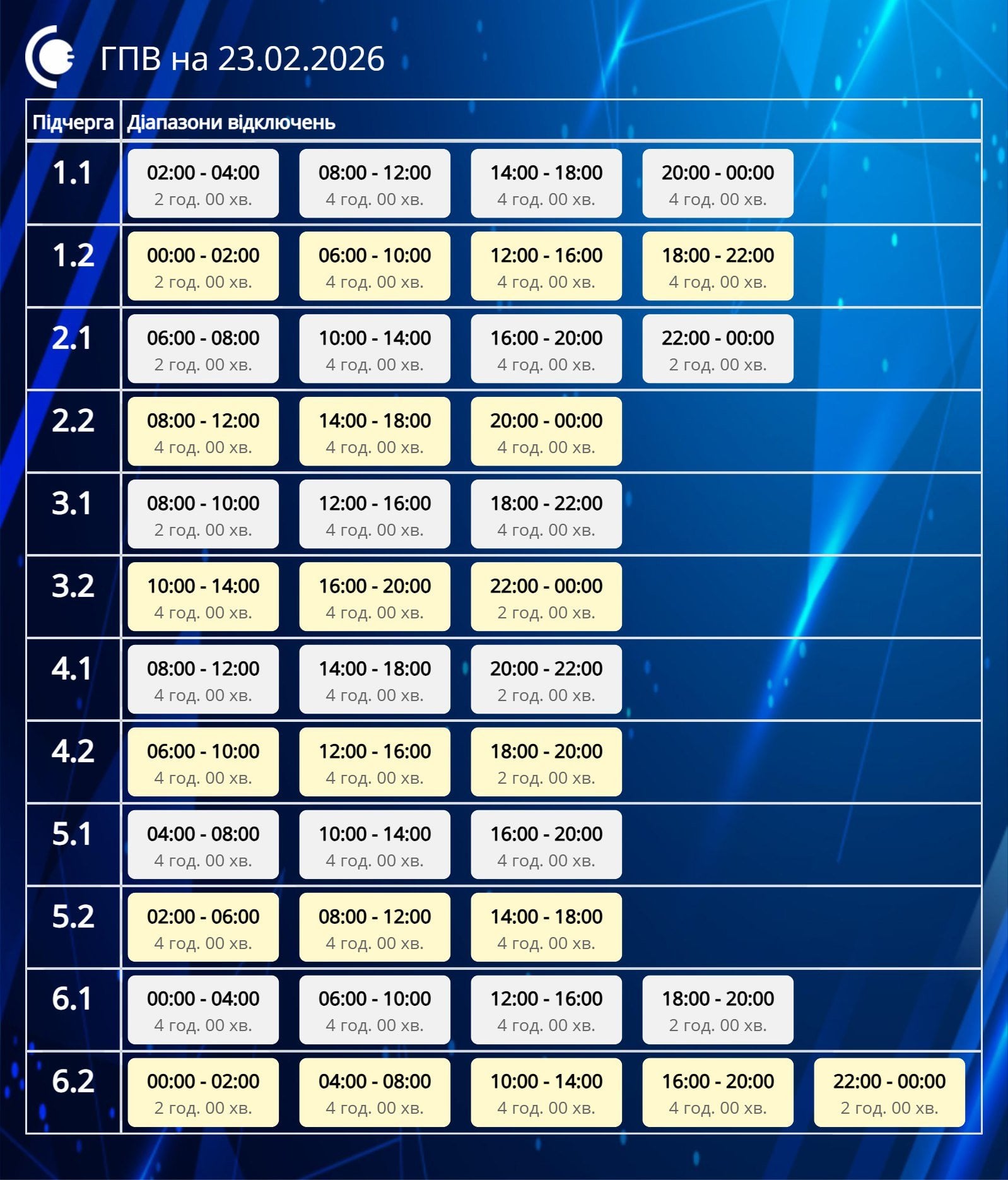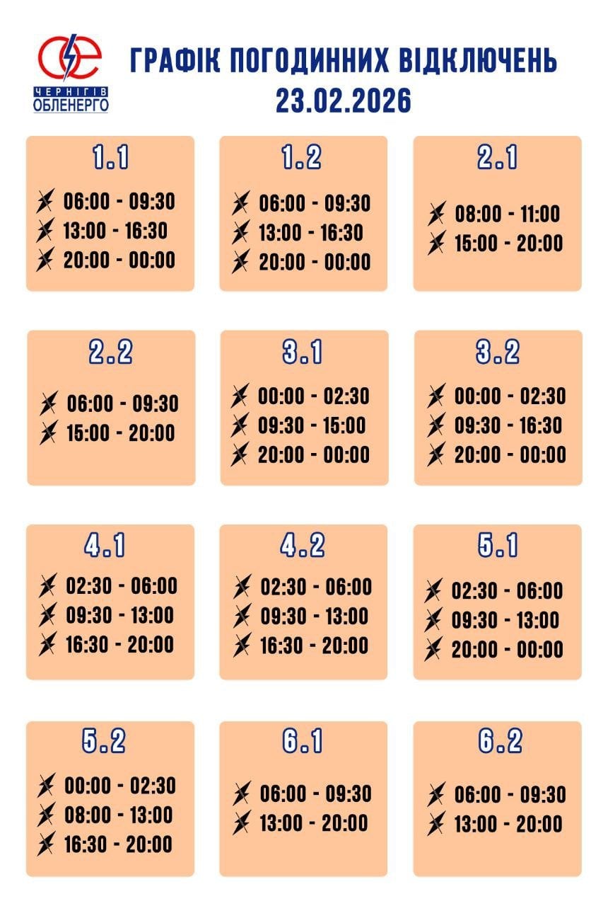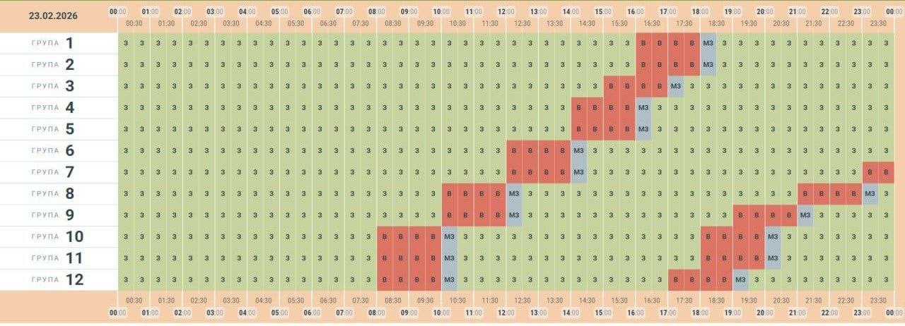 За розпорядженням НЕК "Укренерго" 23.02.2026 буде діяти наступний графік погодинних відключень.