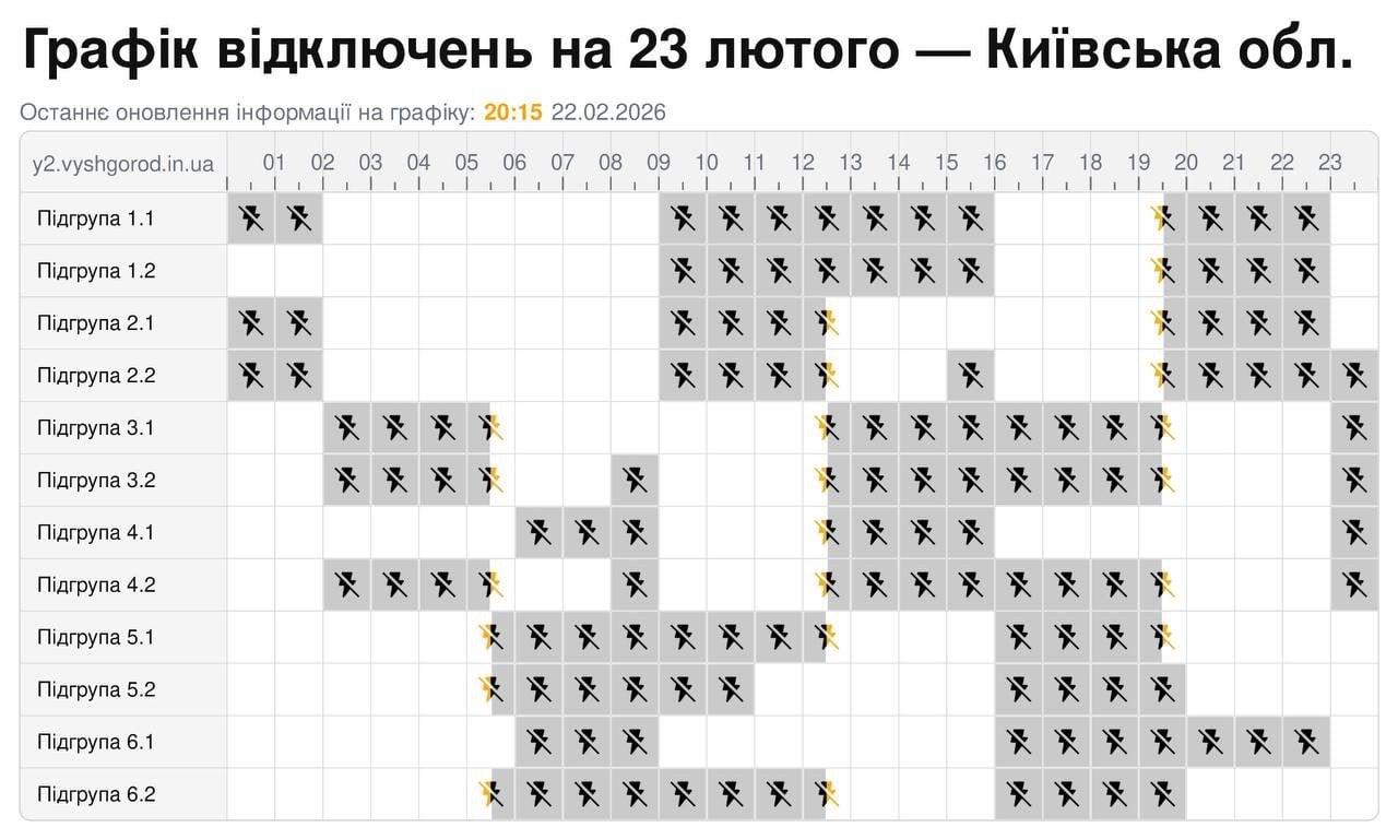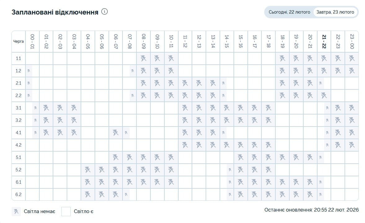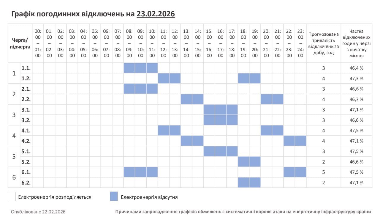 В усіх регіонах Україні у понеділок, 23 лютого, будуть запроваджені графіки погодинних відключень світла. Причина обмежень електропостачання — наслідки російських масованих ракетно-дронових атак на енергооб’єкти.