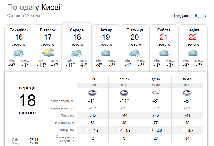 Прогноз погоди в Києві на 18 лютого / © скриншот