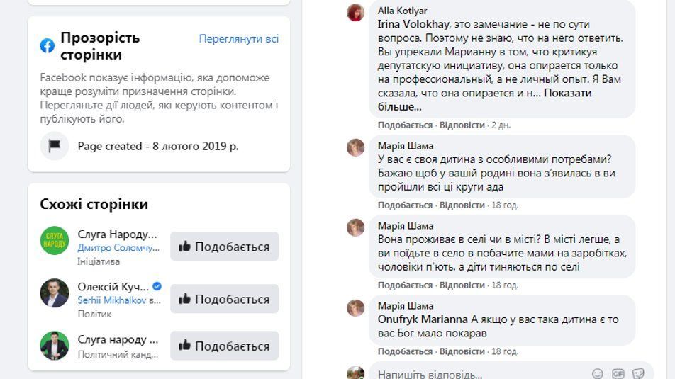 Керівниця ГО "Соціальна Синергія" Маріанна Онуфрик опублікувала скріншот коментаря, який нібито залишила директорка Костопільської спецшколи Марія Шама. Маріанні, яка виховує дитину з інвалідністю й відстоює право на сім'ю таких дітей, Марія відповіла: "А якщо у вас така дитина є, то вас Бог мало покарав".