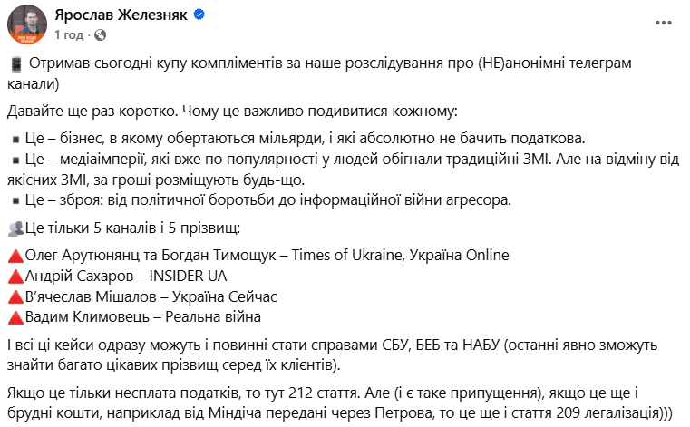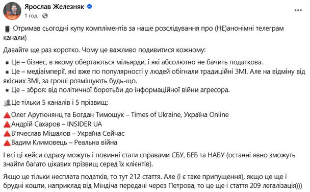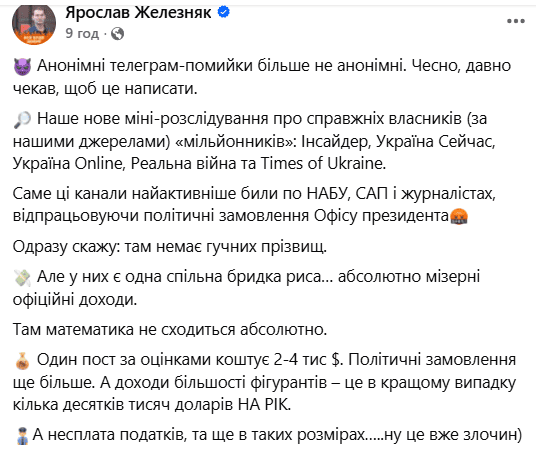 Раніше нардеп Ярослав Железняк опублікував розслідування про Telegram-канали «мільйонники», зокрема пабліки «Інсайдер», «Україна Сейчас», «Україна Online», «Реальна війна» та «Times of Ukraine».