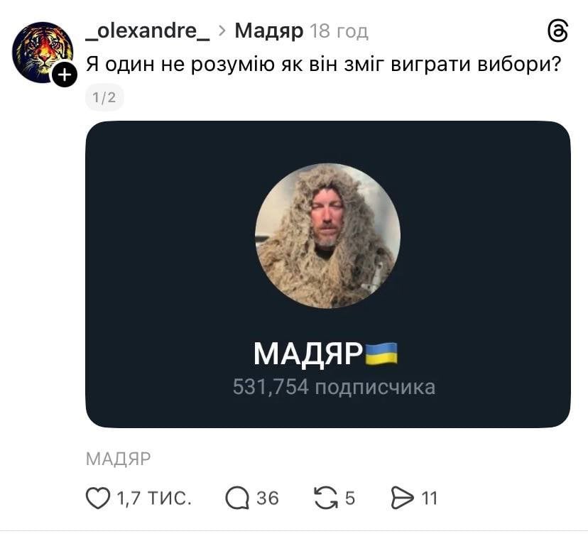 Жартують користувачі соцмереж і щодо прізвища нового майбутнього прем’єра Угорщини Петера Мадяра, адже позивний «Мадяр» має очільник Сил безпілотних систем ЗСУ Роберт Бровді. Юзери іронізують, що тепер в Угорщині керуватиме український військовий.