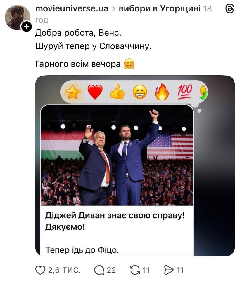 Меми також стосуються тематики нещодавнього візиту віцепрезидента США Джея Ді Венса до Будапешта. З’явилися жарти про те, що де б не побував Венс, усе йде не за планом. Зокрема, користувачі зазначають: