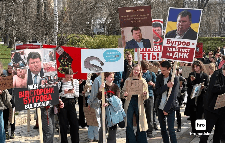 Під стінами Червоного корпусу зібралося кілька сотень студентів. У руках мітингарі тримали саморобні плакати з портретами ректора — на деяких Бугрова порівнювали з американським сексуальним злочинцем Джеффрі Епштейном, і скандували «КНУ — не бордель», «Бугров — на експертизу», «Чуй студентство або йди».