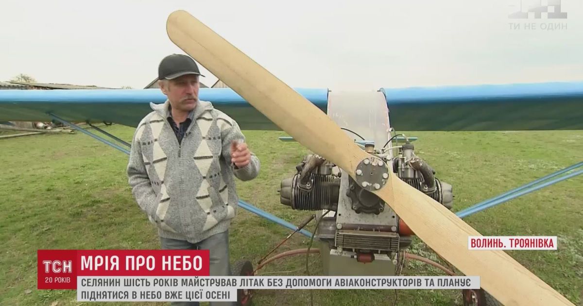 Без креслень та схем волинський селянин уже 6 років будує власний літак - з поливної труби, коліс від тачки та автомобільного двигуна. Про це йдеться в сюжеті ТСН.19:30.