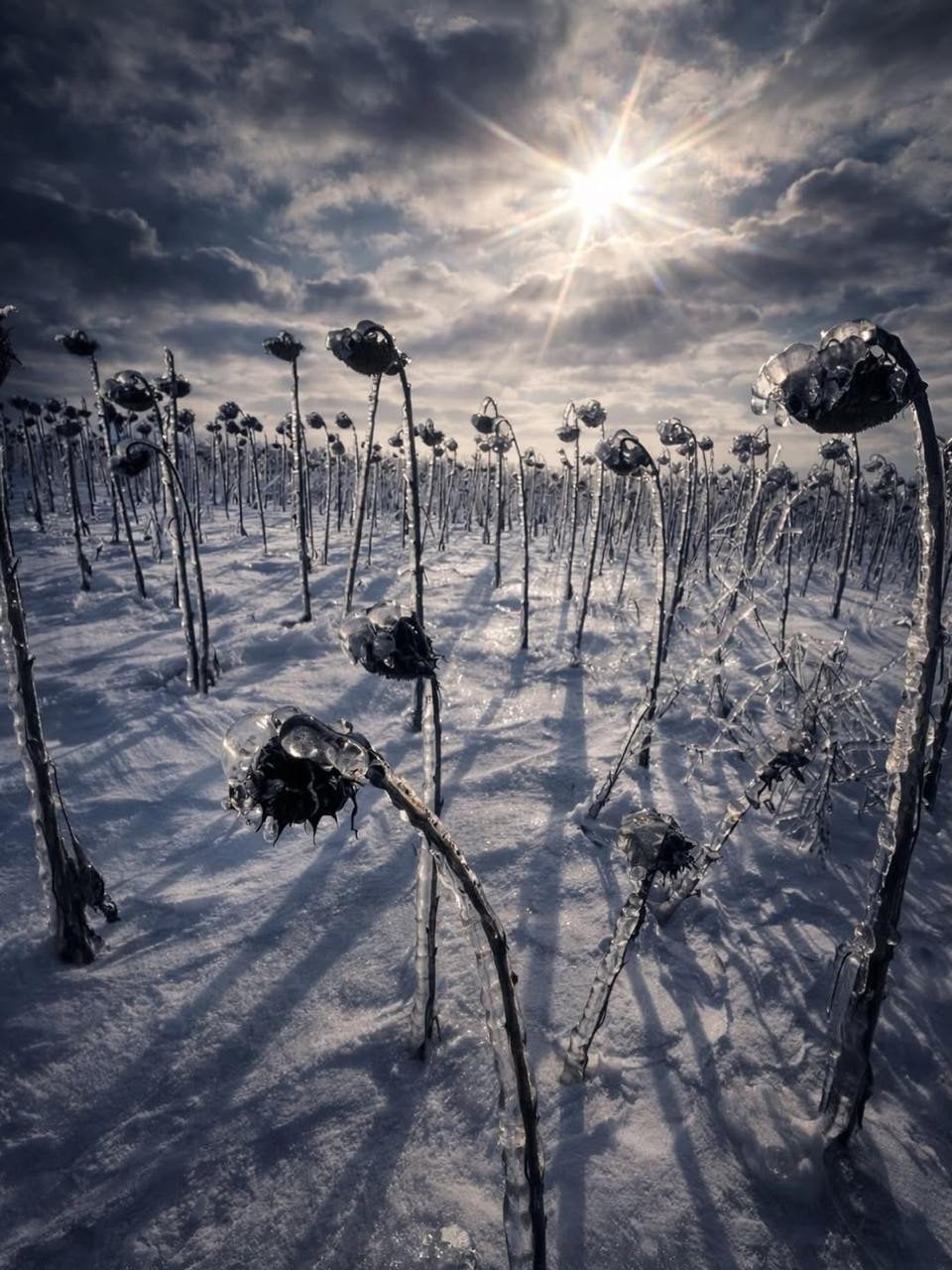 А нижче — рослини в бурульках, огорнуті сонячним промінням.