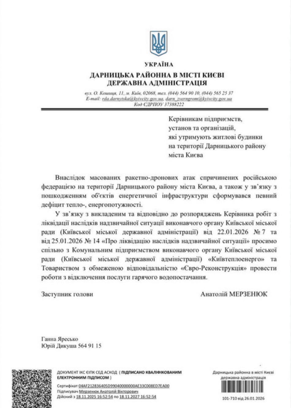 У документі зазначається, що через масовані ракетні та дронові удари з боку Росії в Дарницькому районі, а також унаслідок пошкодження об’єктів енергетичної інфраструктури, виник дефіцит теплових і енергетичних потужностей.