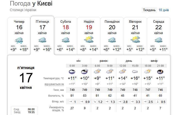 У Києві вночі очікується від +6 до +8 градусів тепла, вдень — до +16 градусів тепла.