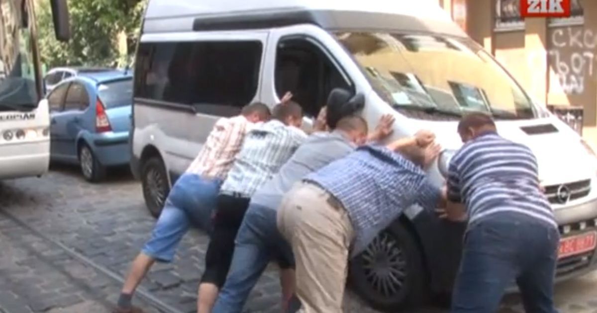 У Львові на вулиці Котляревського п'ятеро львів'ян вирішили буквально власними руками розібрати затор, який заблокував рух.