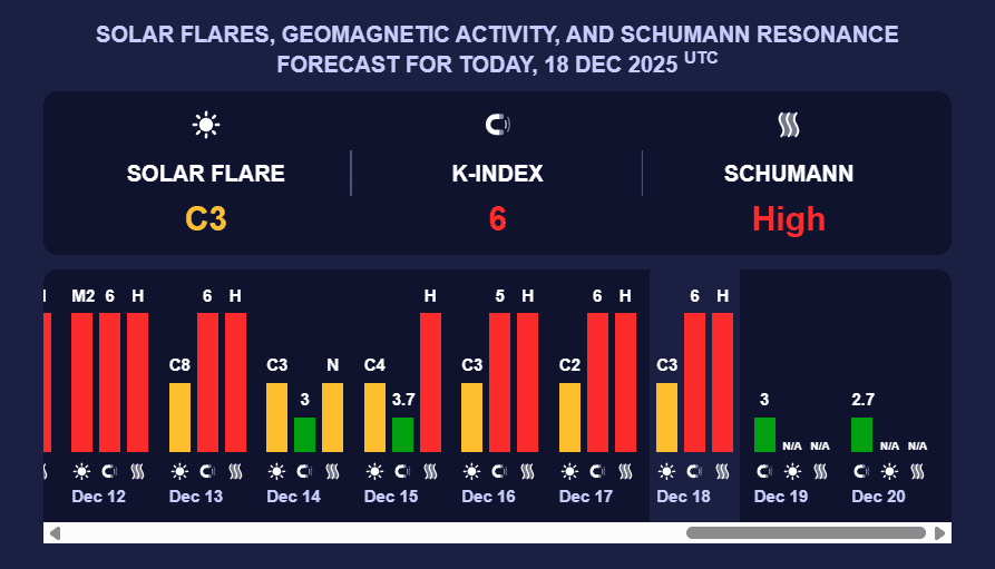 У п’ятницю, 19 грудня, магнітна буря послабиться і опуститься до зеленого рівня - К-індексу 3. Ще вчора активність сонця була дуже потужною.